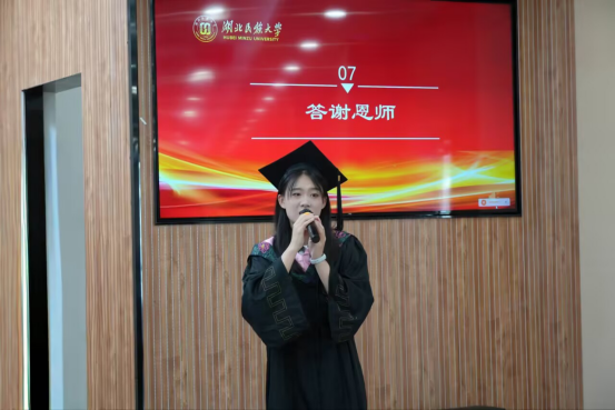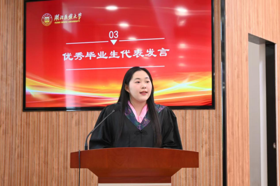 优秀毕业生代表易星辰在发言中深情回顾大学时光,感恩学院领导、老师的悉心栽培与谆谆教诲。她勉励同窗: “愿我们始终心怀热忱,朝着理想坚定前行,在人生的壮阔画卷上,挥毫写下属于自己的璀璨篇章!”