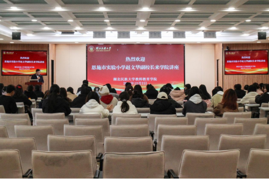 本网讯(通讯员 伍尉 邓紫靓 胡聪颖)2024年12月2日,恩施市实验小学副校长赵文华作客教师教育学院“红烛光·师德讲堂”,以“练好基本功,当好引路人”为题作报告,报告会由教师教育学院副院长邱世兵主持,朱薇博士聆听讲座,教师教育学院小学教育本科专业全体学生到场聆听。