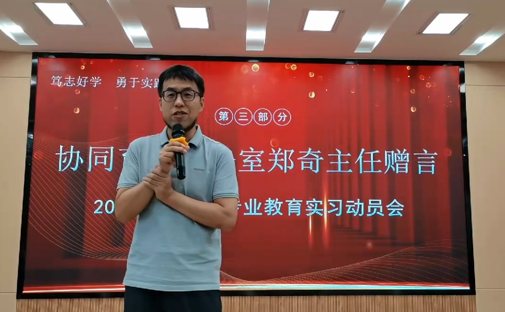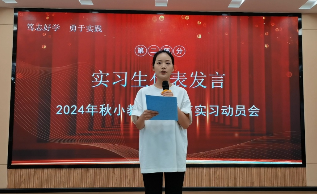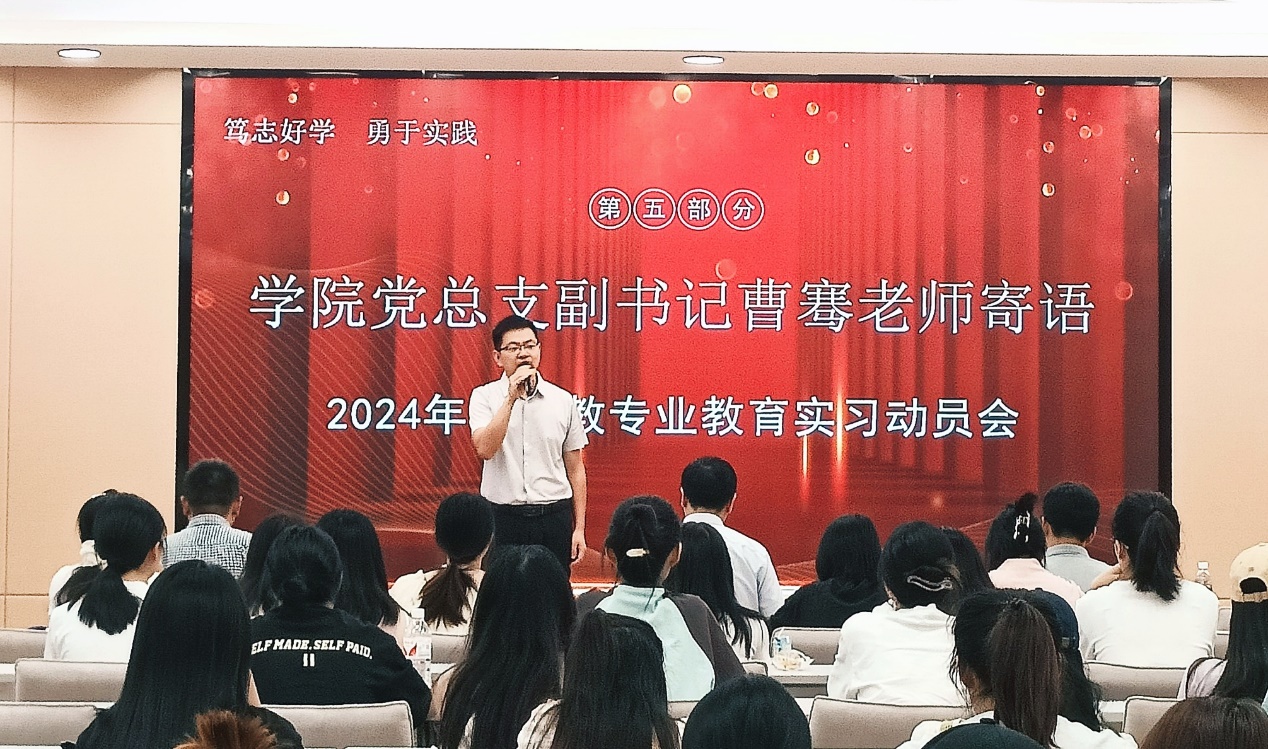 会上,副院长邱世兵结合自身实习经历,向同学们分享了以学生为中心的教育理念和反思与成长的教育哲学。他激励同学们直面实习挑战,把实习当作成长的宝贵机会,并期待同学们在实习中取得丰硕成果。协同育人办公室主任郑奇鼓励同学们以积极心态投入实习,体验师德,形成真实认知。实习生代表雷伏链向学院、实习学校以及老师们表达衷心的感谢,号召同学们抓牢实习机会,锻炼教学技能,提升综合素养。党总支副书记曹骞勉励同学们要在实习中沉浸式体验教育的魅力与挑战,充分展示师范生的技能和素养,为未来教师职业生涯打下坚实的基础。