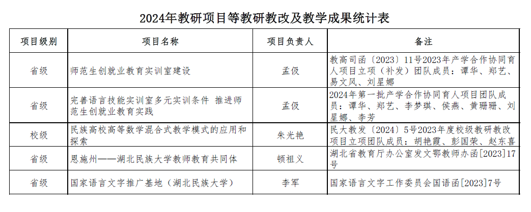 2024年教研项目等教研教改及教学成果统计表