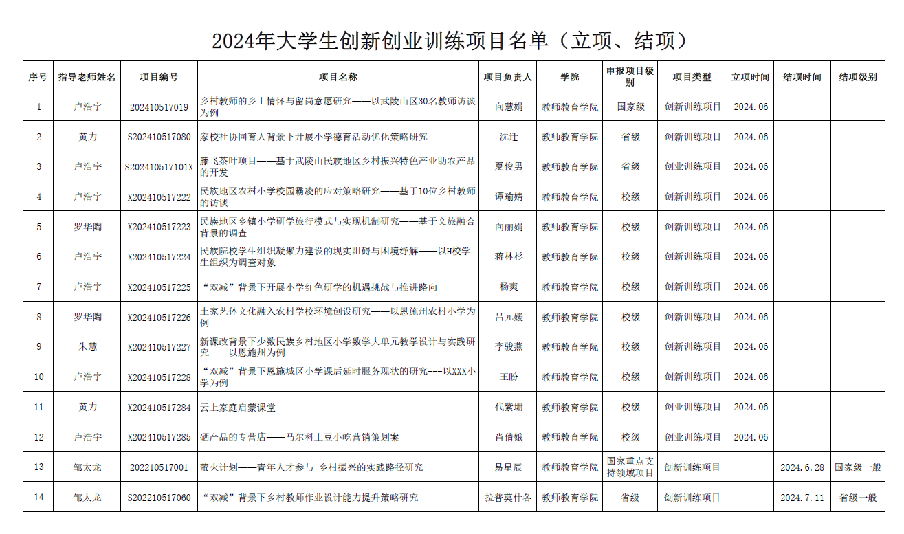 2024年大学生创新创业训练计划项目名单(立项、结题)