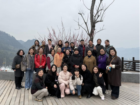 沿盘山小径步入梅园,粉白嫣红缀枝头,落英似雪漫纷飞。老师们漫步于花海之中,或驻足欣赏,或轻声交谈,或拍照留念,林间欢笑声与相机快门声交织成春日序曲。观景台上,全员合影定格下“半边天”的自信风采;休憩亭中,三五围坐畅谈工作与生活,花香伴着书香氤氲流淌。此时的她们,卸下了平时生活工作中的各种角色,只是山风中的大笑者、落花间的追光人,如同温暖绽放的梅花,暗香润物。