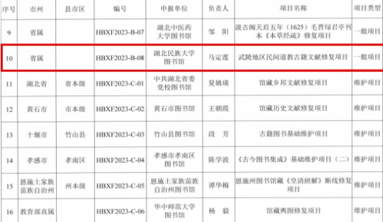 据悉,湖北省历史文献修复项目立足于完善湖北省古籍文献传承体系,由湖北省文化和旅游厅主管,湖北省古籍保护中心组织实施,每年开展一次全省历史文献修复项目评审立项,入选项目将获得省文旅厅在资金、技术、人才等方面的支持。2023年度修复项目经过各地积极申报、专家评审、省文旅厅审议,最终16个项目入选,其中,重点项目2个,一般项目8个,维护项目6个。我馆马定莲老师连续两年获批湖北省历史文献修复项目。