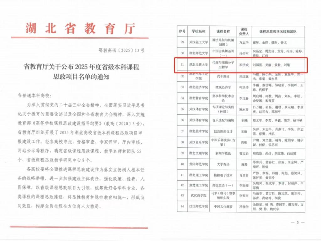 近日,湖北省教育厅公布2025年度省级本科课程思政项目名单,365电子娱乐官方网站图书馆馆长罗洪斌教授主持负责的《代谢与细胞分子生物学》课程成功入选省级课程思政示范课程。课程团队及其成员同时被认定为省级课程思政教学名师和教学团队。