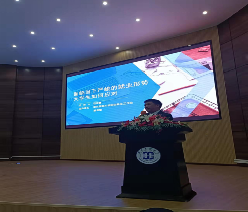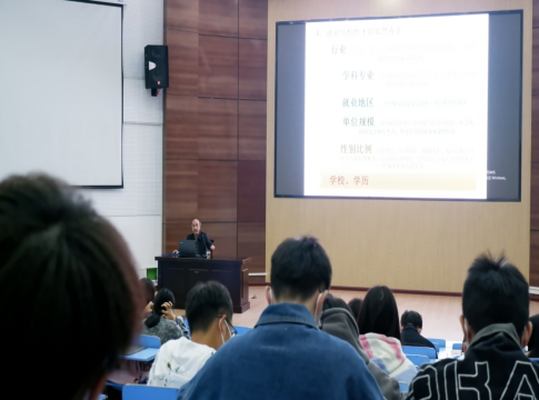学校招生就业工作处副处长、副教授、从事毕业生就业工作20余年的石华富老师作了题为《面临当下严峻的就业形势,大学生如何应对》的专题讲座。历时七十分钟的讲座,石教授从行业需求、学科专业、就业地区、单位规模、性别比例、学校和学历等方面详细分析了当代大学生就业环境与形势依然存在就业结构性的矛盾,面对严峻形势大学生应该做好职业生涯规划、提高社会适应能力、转变择业观念等,他建议大家遵循“就业、择业、再创业”的选择策略,从实际出发,树立大众就业观。