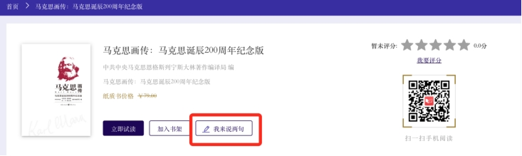 点开图书的详情页“我来说两句”按钮,在评论框里直接输入书评内容,点击提交即可上传书评。基于网络语言及内容安全,用户评论内容会在提交后进行后台自动敏感词审核,审核通过即可发布成功,审核失败评论将被取消发布;同时,还可查看其他书评、回复书评或者给书评点赞。