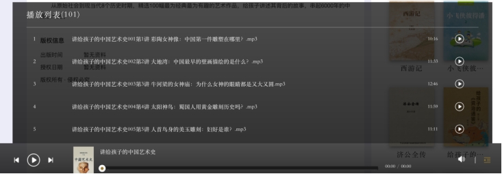 书香平台提供听书超过三万集,用户可以在书香平台查找收听本机构听书。在页面上点击“听书”导航按钮,即可看到平台上的听书推荐。用户可以搜索需要的听书,点击听书封面,即可进入听书页面。