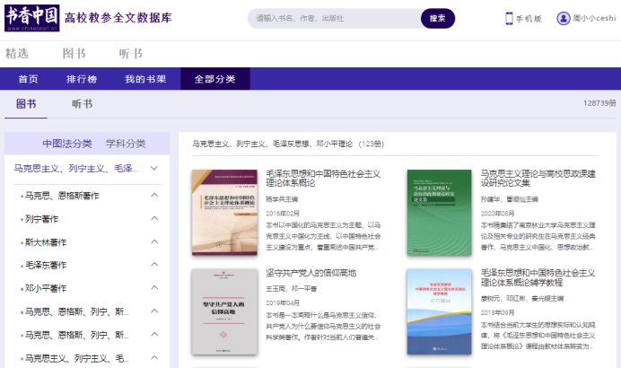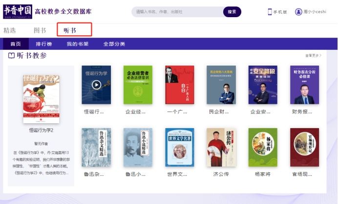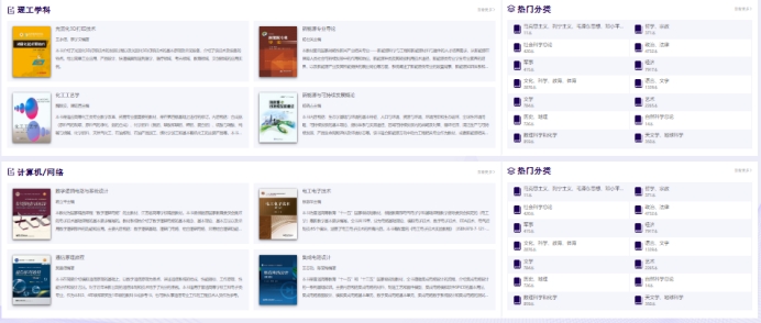 高校教参全文数据库平台提供的优质图书超过12万种,有声听书9000多集。在各频道首页中的不同书单栏目中浏览推荐的图书。阅览室页面右边有详细的热门图书分类或资源排行榜,点击相应的图书封面即可进入资源详情页并开始阅读。