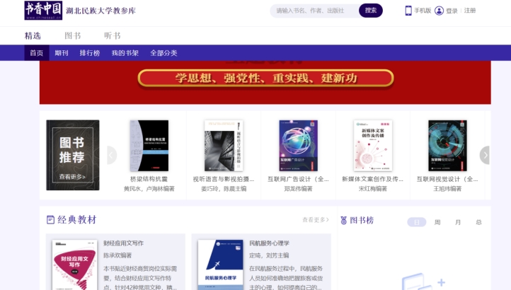 打开高校教参全文数据库网站:在校园IP段范围内用浏览器网址栏中输入http://hbmy.chineseall.cn进入平台。如下图所示,点击右上角“注册”按钮进行用户注册,在校园IP地址内访问PC端平台,并注册账号,完成注册后,使用账号可以在全世界任何方实现PC端或APP端登录(不限制IP地址使用)。