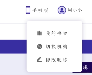 普通用户:包括个人书架、机构切换(需手机号绑定多个机构才提供此功能)、修改密码、修改昵称、手机解绑、退出登录功能