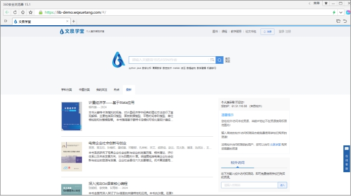 3. 学术文献和大众阅读资源没有并发用户限制,教材类电子书资源限定5个并发用户。