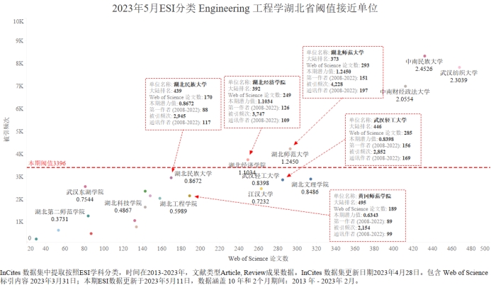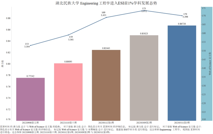 本期我校有望进入ESI前1%的学科为Engineering 工程学,潜力值为0.8672,论文数170,引用量2945,本期入围阈值为3396。