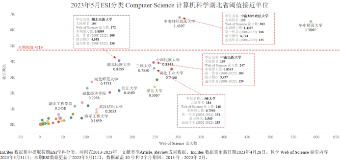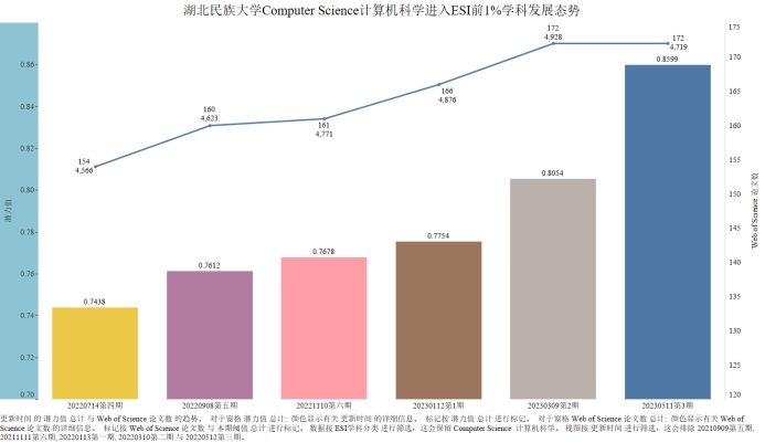 本期我校有望进入ESI前1%的学科为Computer Science 计算机科学,潜力值为0.8599,论文数172,引用量4058,本期入围阈值为4719。