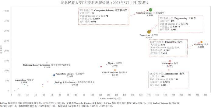 本期我校ESI学科分类数据来看,发文量最多的学科为Chemistry 化学235篇,引用量最高的学科为Computer Science 计算机科学4058次,潜力值最高的学科为Engineering 工程学0.8672。
