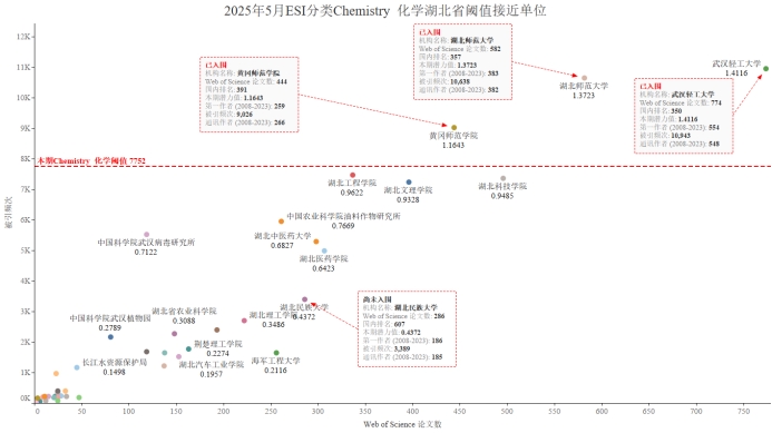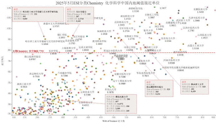 本期我校有望进入ESI前1%的学科Chemistry化学学科,潜力值为0.4372,论文数286,引用量3389,本期入围阈值7752。