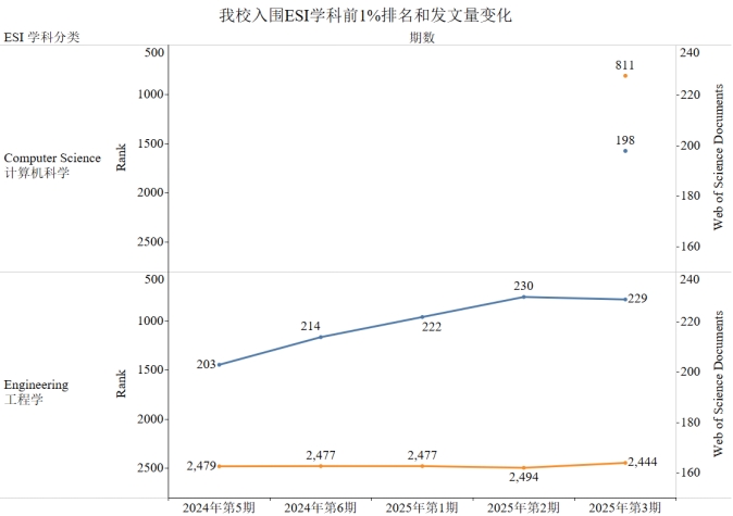 图2为我校ESI入围学科每期全球排名和发文量情况,本期全球共有2685所机构进入了ESI分类Engineering工程学学科前1%,我校Engineering工程学学科排位第2444位,发文229篇,比上一期2494位提升50个名次。本期全球共有836所机构进入了ESI分类Computer Science计算机科学学科前1%,我校Computer Science计算机科学首次入围全球排811位,发文198篇。