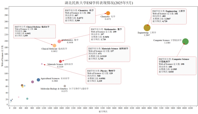 表1为本期我校ESI分类各学科态势情况,发文量、被引频次与潜力值的分布,球越大表明潜力值越高,当中Engineering工程学和Computer Science计算机科学已经入围,潜力值最高的为Chemistry化学0.4372。