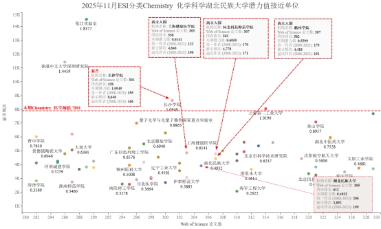 本期我校有望进入ESI前1%的学科Chemistry化学学科,潜力值为0.4932,论文数305,引用量3892,本期入围阈值7891。