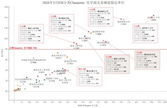 本期我校有望进入ESI前1%的学科Chemistry化学学科,潜力值为0.5383,论文数319,引用量4286,本期入围阈值7962。