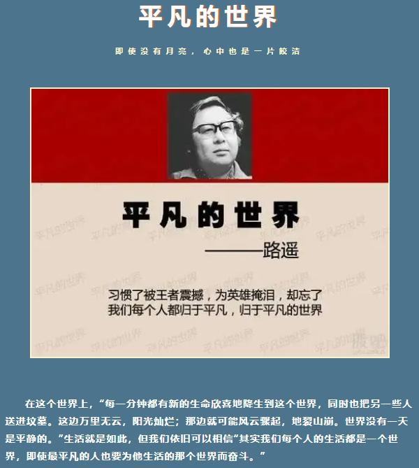 路遥在书中说到:生活包含着更广阔的意义,而不在于我们实际得到了什么;关键是我们的心灵是否充实。正值青春年少的我们都应该去读一读《平凡的世界》,或许我们可以更好地理解:尽管命运是那样的不公,尽管社会有那么多的不公,可只要你能够不屈不挠、艰苦奋斗,终能获得最后的成功,生活将永远不能打败你。