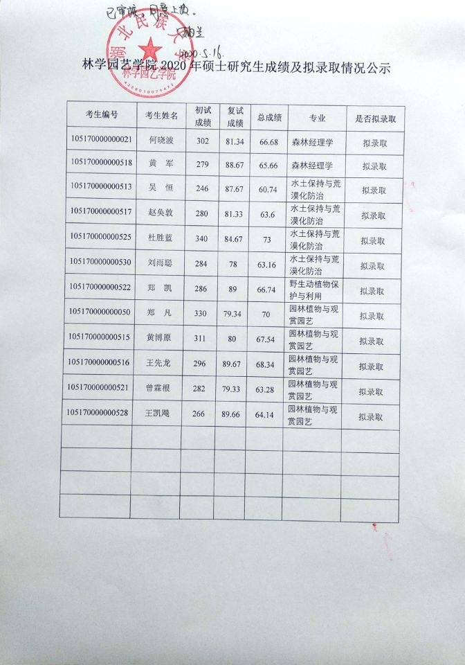 林学园艺学院2020年硕士研究生成绩及拟录取情况公示
