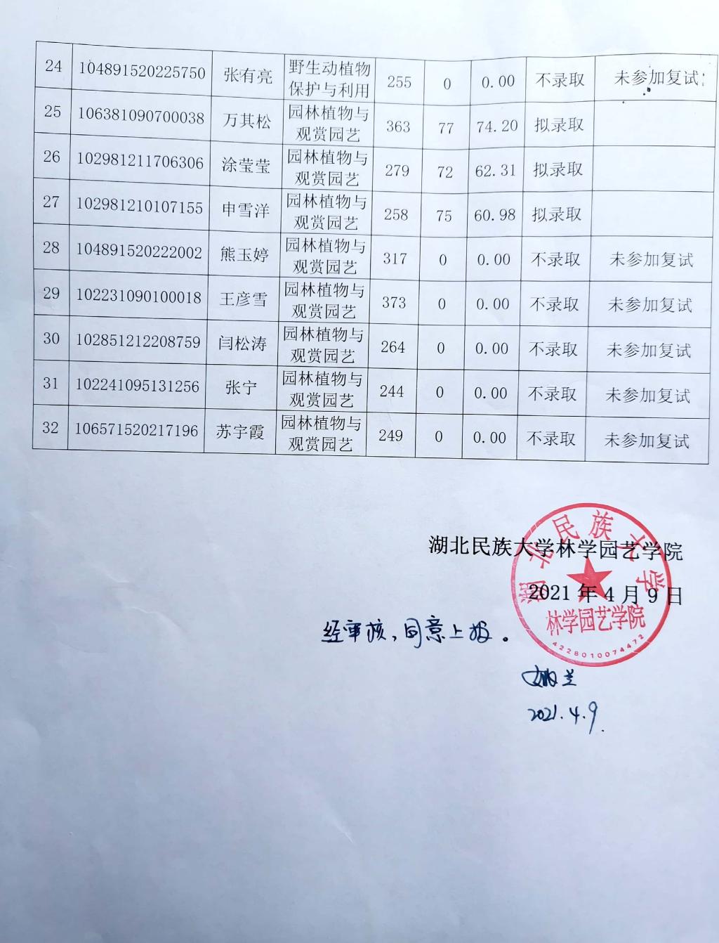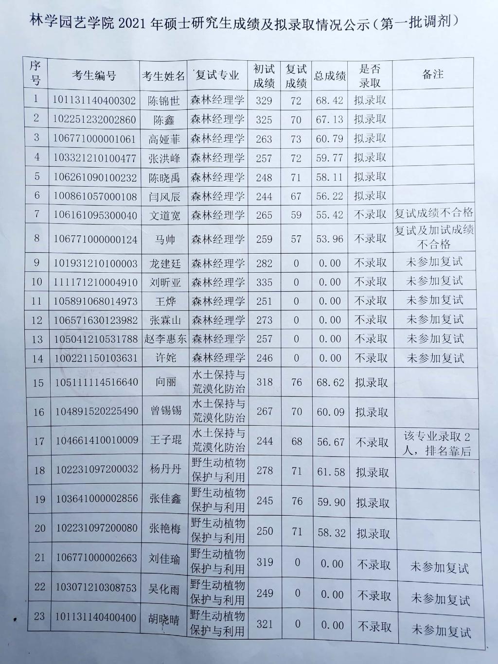 林学园艺学院2021年硕士研究生成绩及拟录取情况公示(第一批调剂)