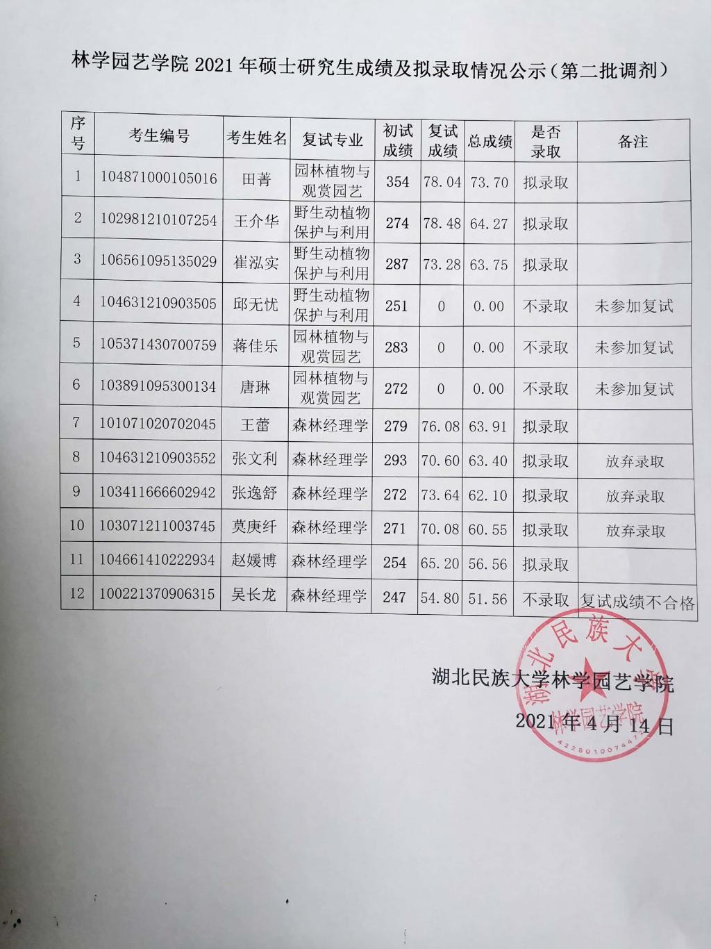 林学园艺学院2021年硕士研究生成绩及拟录取情况公示(第二批调剂)