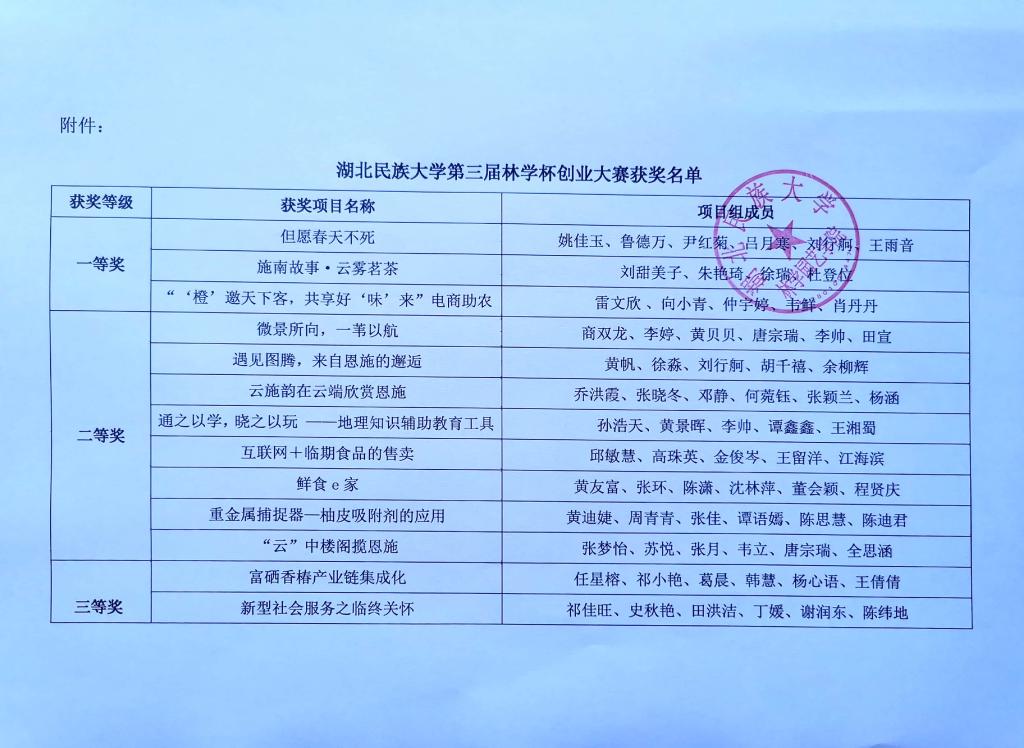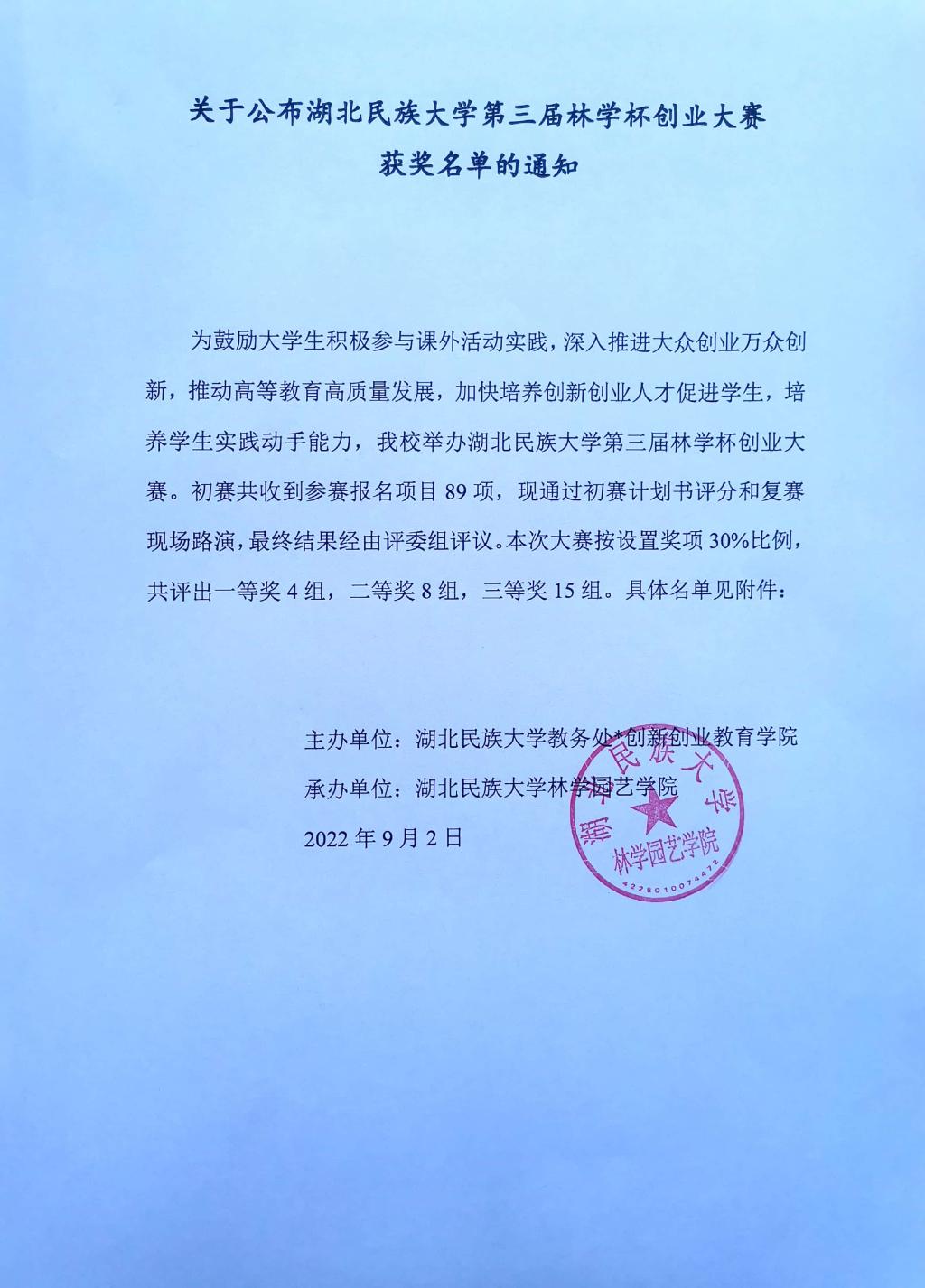 关于公布365电子娱乐官方网站第三届林学杯创业大赛获奖名单的通知