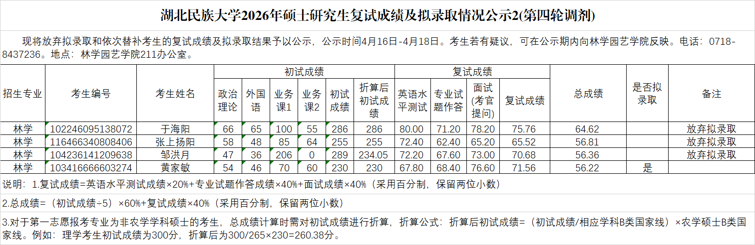 林学园艺学院2026年硕士研究生复试成绩及拟录取情况公示2(第四轮调剂)