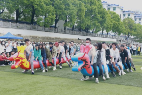 本次趣味运动会设有“陆地龙舟”、“瑜伽球竞速”、“拔河”、“袋鼠跳接力赛”、“跳绳接龙”、“两人三足踩气球”六个项目。我院学生踊跃报名各项比赛。“陆地龙舟”比赛规则由五男五女组成的“龙舟”队,每个小组都整装待发,只待比赛开始。随着裁判“开始”口令的发出,各队协作融洽,配合默契,现场观众加油呐喊,共同跟随“龙舟”向着终点前进。
