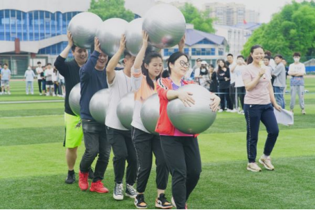 “瑜伽球竞速”比赛中,五名队员在过程中相互配合,运送瑜伽球前往终点。小组成员或稳中求快或疾步如飞,在比赛场地你追我赶。教师组也毫不逊色,在运输过程中相互配合。