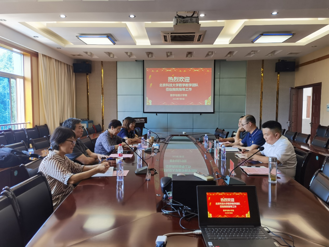 7月5日下午,北京科技大学数学教学团队张志刚教授、范玉妹教授、刘秀芹教授、苏永美教授一行来我院调研交流。学院院长魏代俊教授、副书记易金桥教授、数学系主任向中义教授、统计系主任向会立教授接待张志刚教授一行。