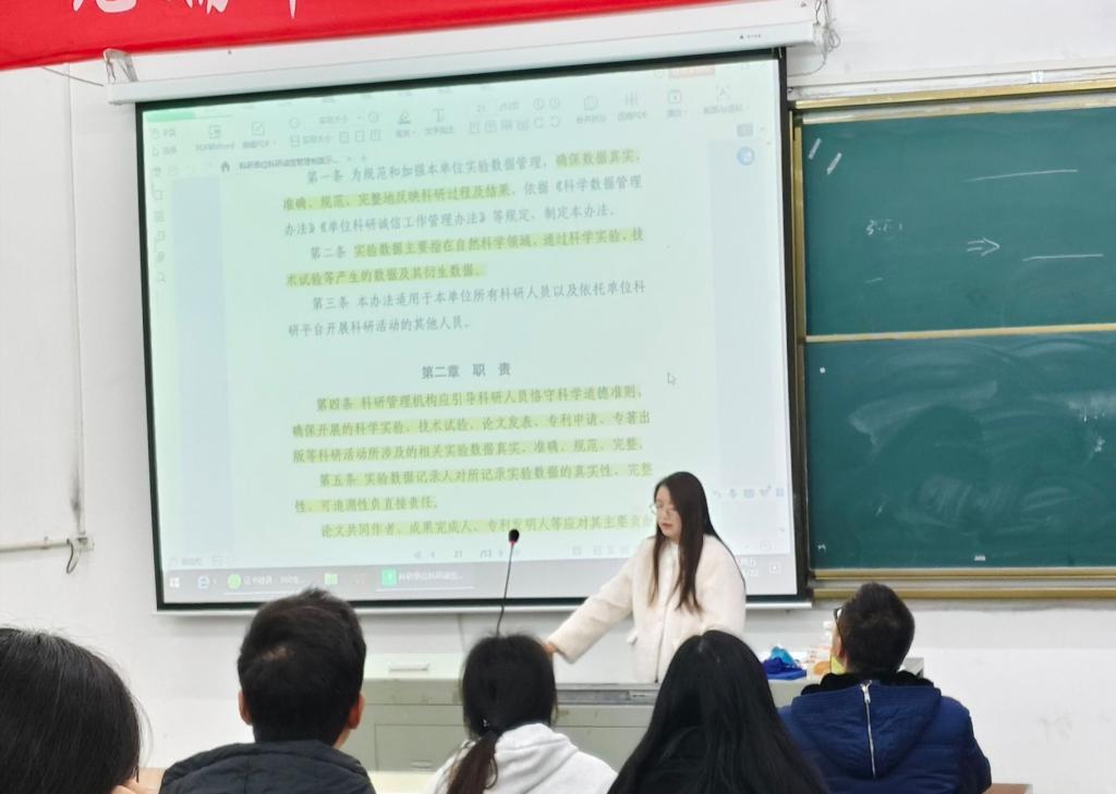 2024 年 11 月 22 日晚,数学与统计学院在3308教室召开关于《科研单位科研诚信管理制度示范文本》的学习会议。学院全体研究生齐聚于此,会议由王清龙老师主持,研究生会学术部讲解。