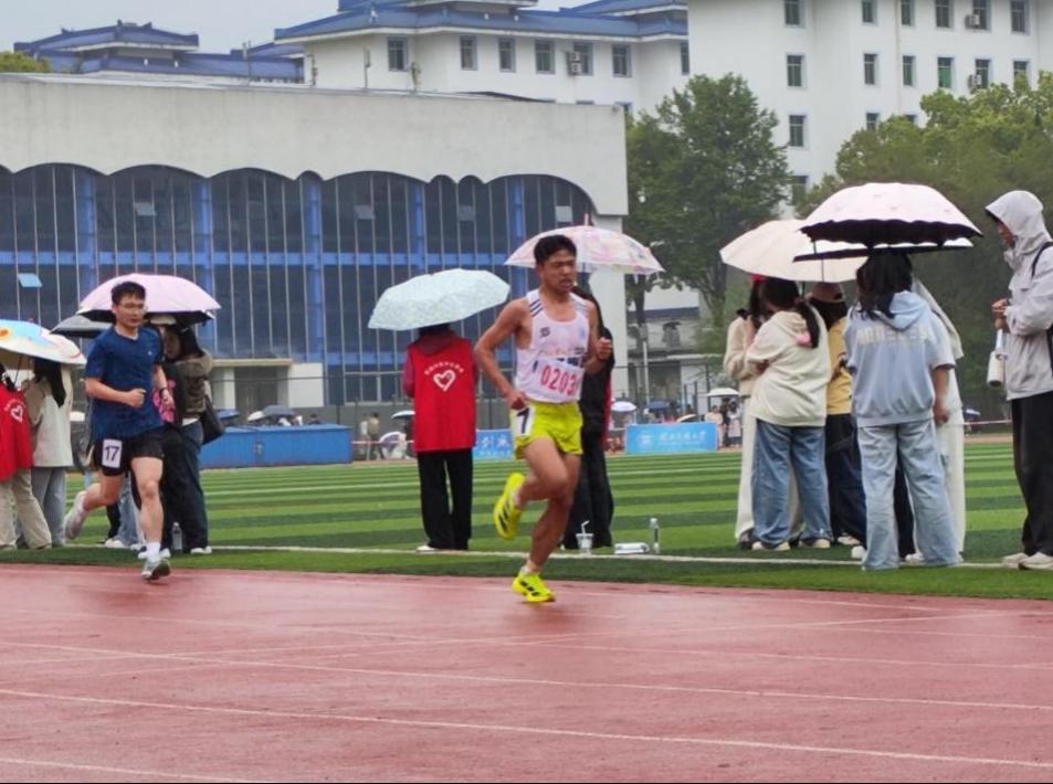 422日下午,校运会男子5000米决赛鸣枪开。数学与统计学院大四学子汪宇浩顶住阴雨天气、沉着冲刺以惊人成绩打破该项赛事保持三十余年的校运会纪录,用一场历史性突破,为学院续写荣光,为自己大学运动生涯画上圆满句号