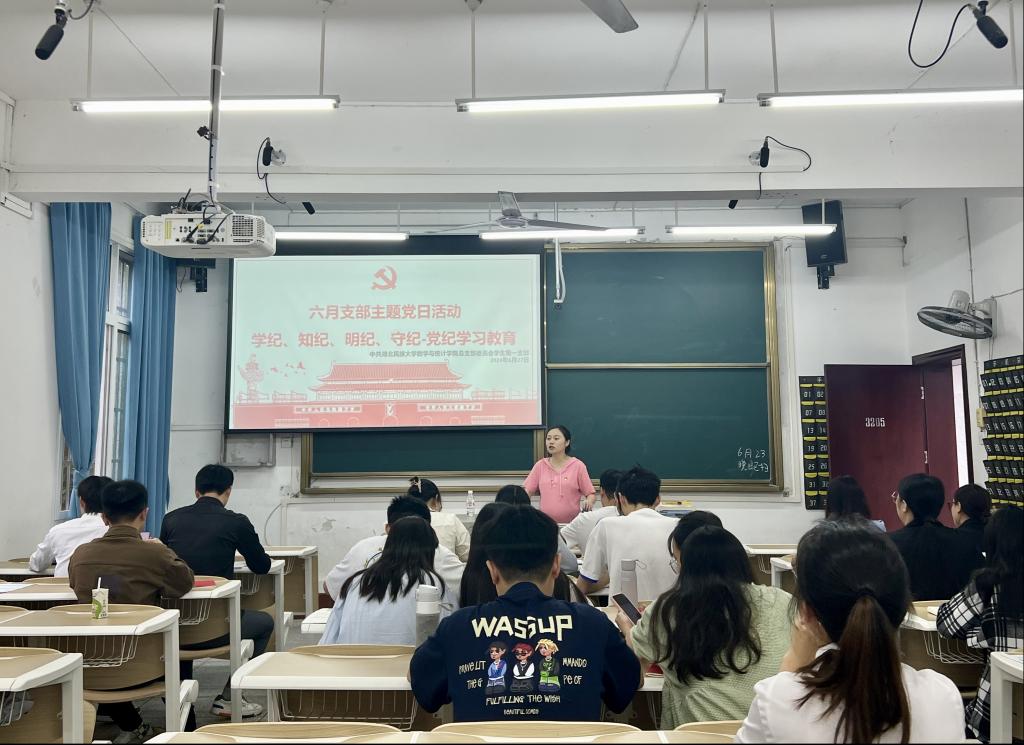 本网讯(记者 田雷虎/文 田雷虎/摄)2024年6月27日下午,数学与统计学院学生第一党支部在3205教室举办主题为“学纪、知纪、明纪、守纪-党纪学习教育”6月支部主题党日活动。本次活动由学生第一党支部书记黄丽娜主持。
