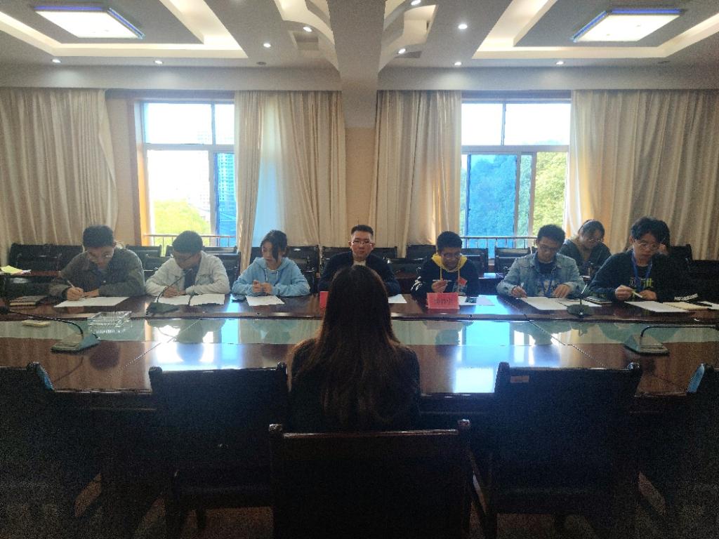 本次面试的形式为所有参与面试的同学在我院3303教室候场,面试者独自进入四楼会议室进行面试。面试者首先进行自我介绍,向面试官展示自己的长处,接着面试官从思想、能力等方面对面试者进行提问。面试官本着公平公正的态度对面试者进行考核。