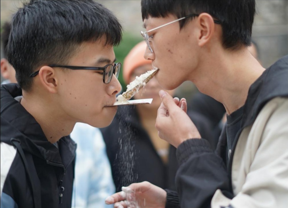 活动中,同学们积极参与,在“比划我猜”游戏环节中,各小组队员们脑洞大开,用奇妙的肢体语言成功让队友猜出一个又一个词语;在考验体力和算数能力的“折返跑”环节中,彰显着同学们的青春活力;在压轴游戏“传面粉”中,各小组斗智斗勇,队员间默契配合,充分调动同学们的情绪,将现场气氛推向高潮。