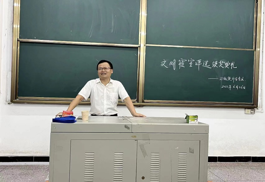 2022年6月26日晚,数学与统计学院2021级统计学专业在3307教室举办了“文明寝室评选”活动颁奖典礼。特邀数学与统计学院党总支书记赵魁轩、数学与统计学院统计系主任向会立担任本次颁奖嘉宾。颁奖典礼由班级文体委员杨砚童主持。