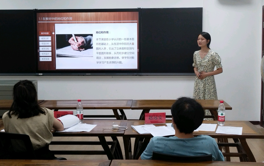 活动伊始,主持人致开幕词。选手按顺序依次进行说课。十位选手借助PPT将巧妙的教学构思展示出来,说课思路清晰,课件新颖生动,个性突出。如一号选手介绍她的课堂可归结为五个字,即“导、忆、引、探、结”,依次脉络详细解说。二号选手通过对指数函数的图像与性质的讲解,培养学生由特殊到一般的思维模式。四号选手借助几何画板工具,形象展示图形,锻炼学生使用数形结合的方式探究问题。八号选手所讲平面图形和立体图形直接联系实物,生动形象。均在规定时间内,充分展示各自的教学风采和特点。