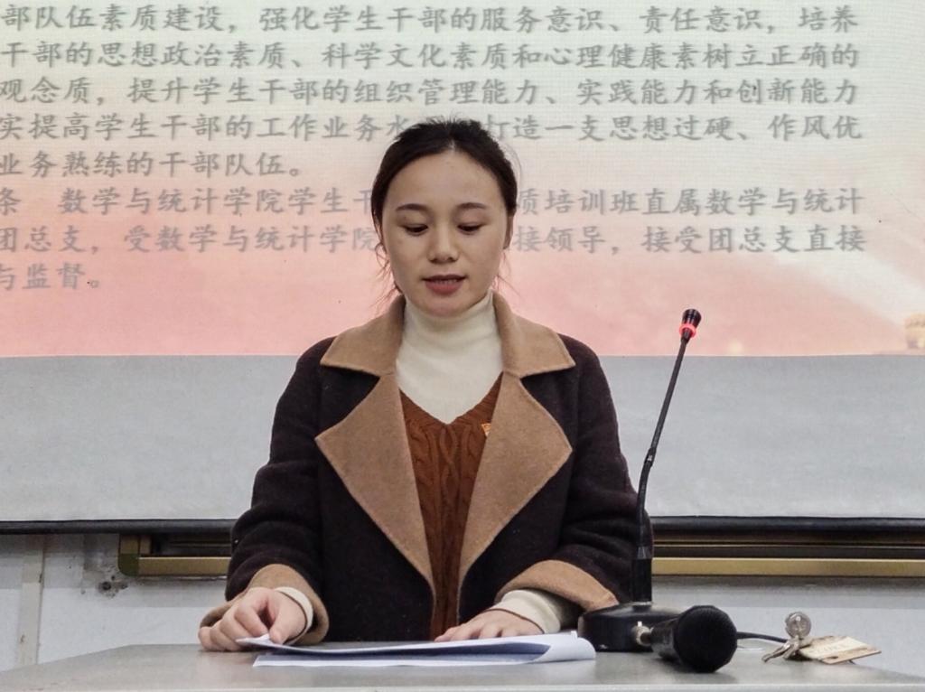典礼伊始,主持人介绍出席老师,宣布开课典礼正式开始,全体起立,奏唱团歌。紧接着,黄老师宣读《365电子娱乐官方网站数学与统计学院学生干部培训班章程》,刘老师宣读《365电子娱乐官方网站数学与统计学院学生干部培训班管理办法》。两位老师提醒同学们要密切配合团学工作,服从安排,在干训中认真学习备考,遵守课堂纪律。开课典礼结束,各位老师有序离场。