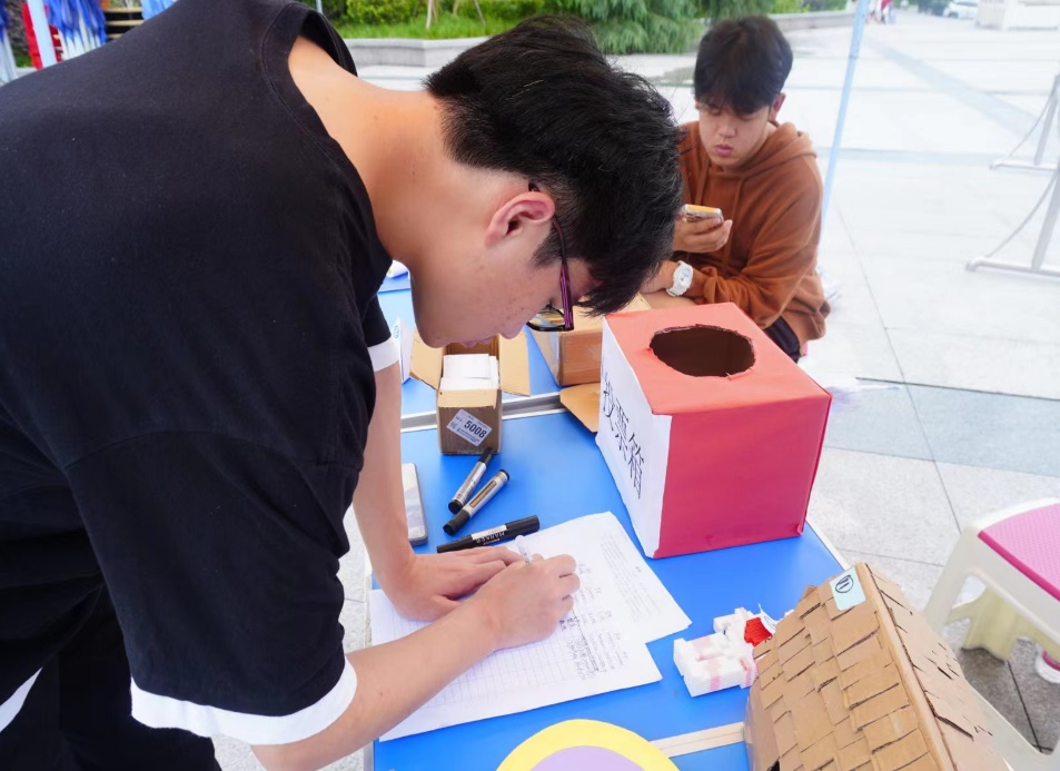 本次活动有三种参与形式,第一:数学趣味小游戏,学生在现场持参与票分别在数独、趣味一笔画、移动火柴的游戏点打卡,通过参与小游戏来激发大家对数学的兴趣。第二:数学模型创意集汇大赛,参赛选手须提前一天上交作品至我院学生会办公室,并在活动现场展出。活动当天,每位通关小游戏的同学可以为自己喜欢的作品投上宝贵的一票。第三:团队闯关比赛,参赛选手三人成队,参加二十四点、魔方复原、知识竞答三个小游戏,根据时间长短评选出一二三名。同时还为大家准备了电风扇,古风扇,蛋仔派对挂件和摇头娃娃摆件等各式各样的小奖品,现场氛围浓厚,效果良好。