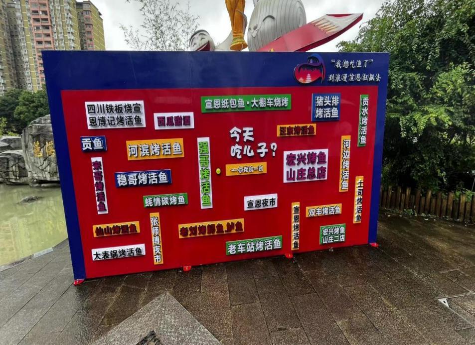 在随后的调研中,团队了解到,在以贡水河为载体所修建的文澜桥边有规划的排布着风情街与烤活鱼店铺。文澜桥每日晚上游客渐多,烤鱼店一般于也于晚上开张,不同店铺招牌各色且有着不同的宣传方式,但都以烤活鱼为重点。同时发现,恩施口音的游客居多,游客大多是居住在州内赶来短途旅行。最后,团队走访各个店铺,了解到价格大致在每人五十元左右。