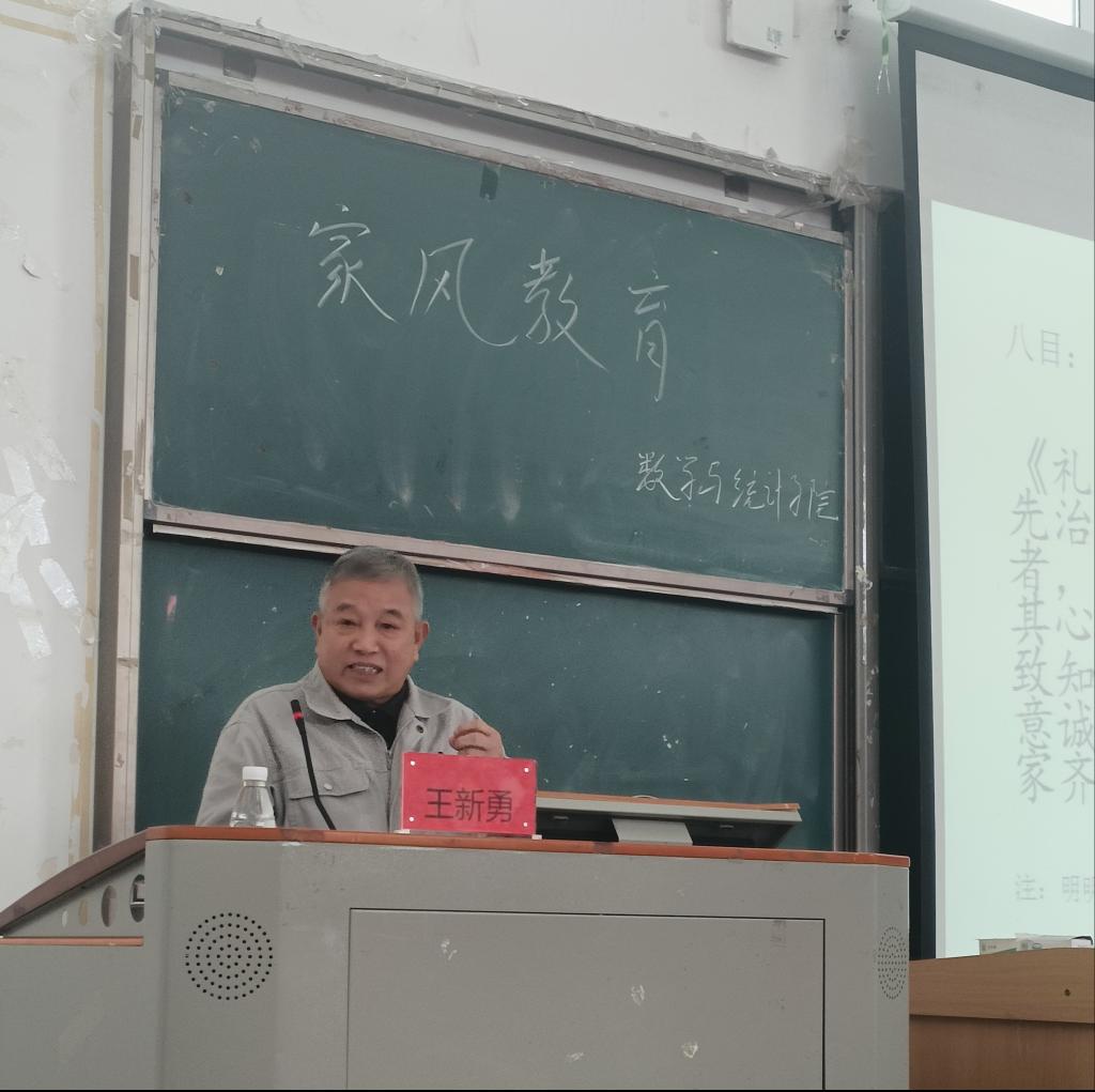 本网讯(记者 刘倩 钟颖鑫/文 刘洋源/摄)为厚植家国情怀,传承优良家风,10月7日下午14:00,数学与统计学院在修远楼5B404开展以“母爱·家风”为主题的教育讲座。我校原文学与传媒学院教授、党委书记、硕士生导师王新勇受邀担任讲座主讲人,我院团总支书记刘聪担任本次讲座主持人,数学与统计学院2023级全体学生到场参加。