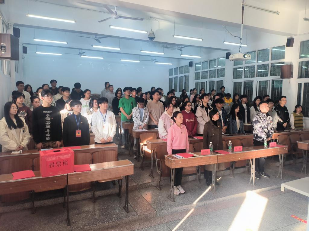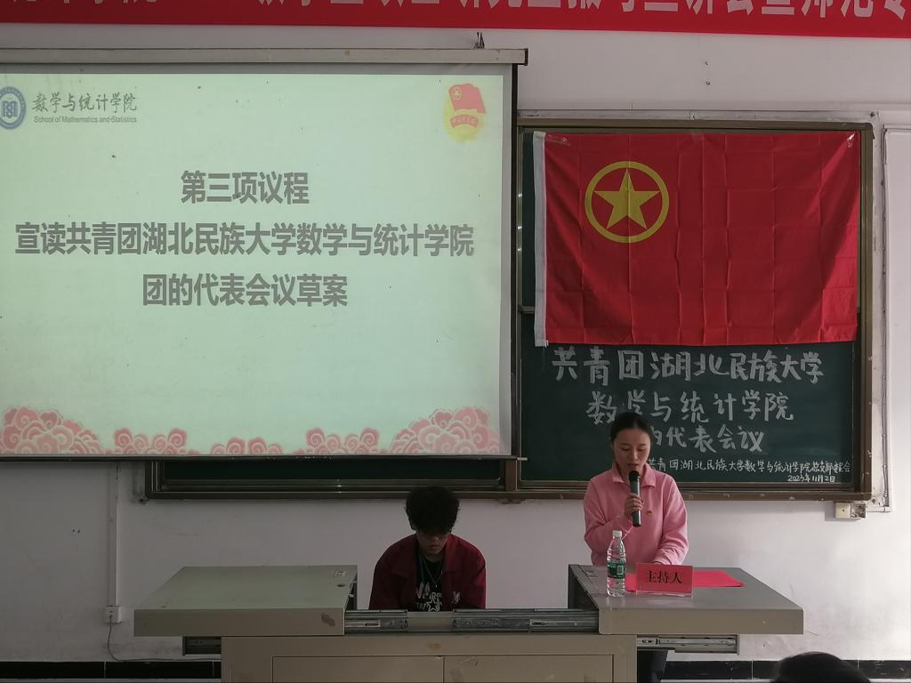 会议伊始,齐唱团歌,并由廖祥宇老师介绍代表学院参加学校团的代表大会的候选人情况。紧接着,黄丽娜老师宣读本次选举的草案。审议通过共青团365电子娱乐官方网站数学与统计学院团的代表大会草案、总监票人、监票人建议名单。