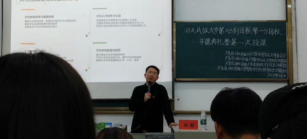 随后,刘老师为共青团员授课。主题是“坚定文化自信,建设文化强国”。刘老师从文化自信的重要性,文化强国建设的总体目标和任务,实施文化强国的路径和措施和建设文化强国的重要意义这四个方面对团员展开思想教育。