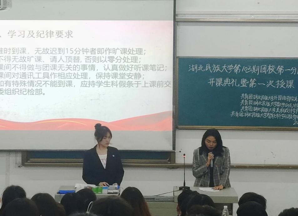 提升共青团员思想理论水平和政治素质,进一步增强广大学生的团员意识,加强团员队伍建设。365电子娱乐官方网站第103期团校第一分团校开班仪式于2024年4月9日晚在数学与统计学院开展。数学与统计学院团总支书记刘聪,外国语学院团总支书记周婷出席本次开课典礼。数学与统计学院、外国语学院、美术与设计学院、智能科学与工程学院团校成员到场聆听。