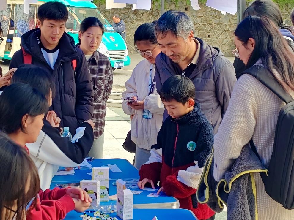 活动现场设置展棚四个,分为个人趣味小游戏和团队数学闯关两大部分。参与者需按要求携带各自首关处拿到的参与票进行游戏,每完成一个小游戏即可在参与票上打勾,集齐两个勾后便可登记签到并领取小奖品。