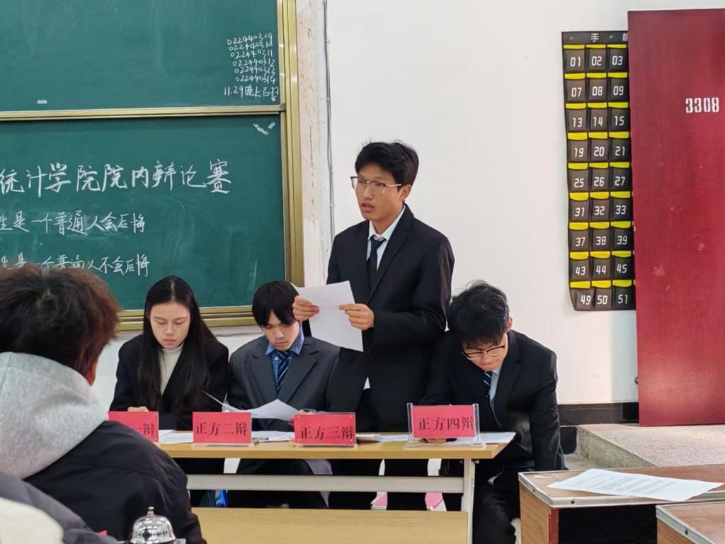 11月30日下午,为锻炼学院新生辩手的口才和思维能力,学院在3308教室举办院内第二场辩论赛。本次辩论赛以“终其一生是一个普通人是否会后悔”为主题,队长刘欣然和徐秋莲、徐澜琼带队,往期优秀辩手毕启航担任评委。