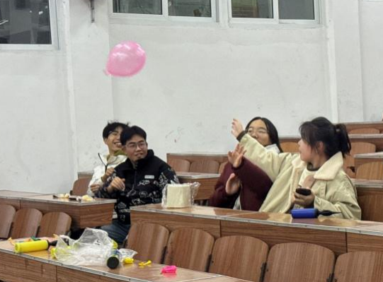 紧接着,击鼓传花和听歌识曲两个趣味小游戏将现场氛围推向高潮。在击鼓传花游戏中,伴随音乐的播放,参与者们以气球为“花”,紧张而兴奋地传递它,每当音乐停止,“花”落谁手,谁便需进行小惩罚,并在完成后获得一份奖励,随后游戏继续进行。而听歌识曲环节则考验着同学们的反应能力和音乐素养,首位准确报出歌曲名者,便能赢得一份精美的礼品。