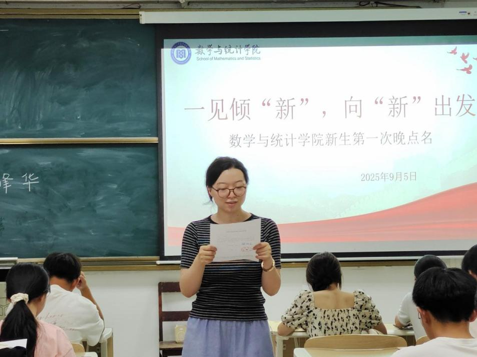为帮助新生尽快适应大学生活,明确军训及开学相关要求,9月5日晚,数学与统计学院在3306、3403和3405教室组织开展“一见倾‘新’,向‘新’出发”主题晚点名活动。全体2025级新生参加,各班班主任主持,院党总支副书记及新生辅导员全程参与巡查指导。
